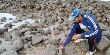 Mussel Power! We are excited that we recorded one additional species to our existing list of 140 marine species from Chimbai Beach. It is probably Asian Green Mussel though the green tinge is missing in this dead specimen. This is a bivalve that is uniquely fixed to locks with a holdfast like threads.